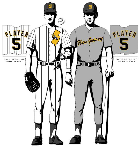 home uniform features pinstripes with a meadowlark and an outline of the state of New Jersey